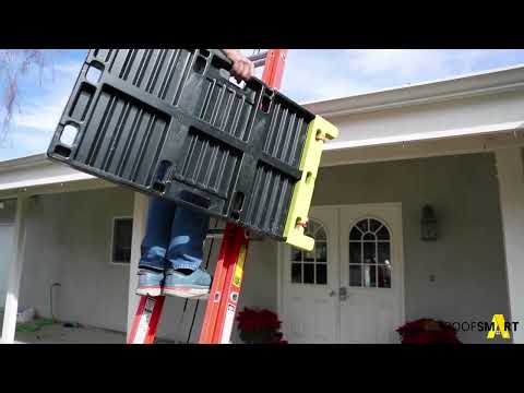 The RoofSmart Pads are a roofers best friend when preventing damage of the roofing materials on the job. They create walkways and workstations on pitches up to 7/12 and steeper pitches if they are tied down. They are made out of durable ABS plastic attached with 3m adhesive to a high density foam. They are light weight and easy to use with attachable accessories to ensure ladder safety and safety on steep pitches. Make sure to visit our Social Media to see videos of the RoofSmart Pads in Action!